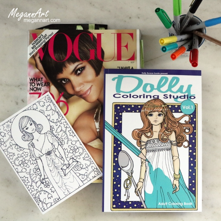 Many of the pages in the adult coloring book, Dolly Coloring Studio, are inspired by a variety of different dolls. Occasionally, the dolls in the book get to wear clothing that appears in Vogue magazine! The Dolly Coloring Studio page highlighted in this post is inspired by vintage Barbie and a few pieces found in the September 2010 issue of Vogue. The doll is wearing a dress inspired by Dagmar with clips and a brooch by House of Lavande (pictured below, bottom right corner).